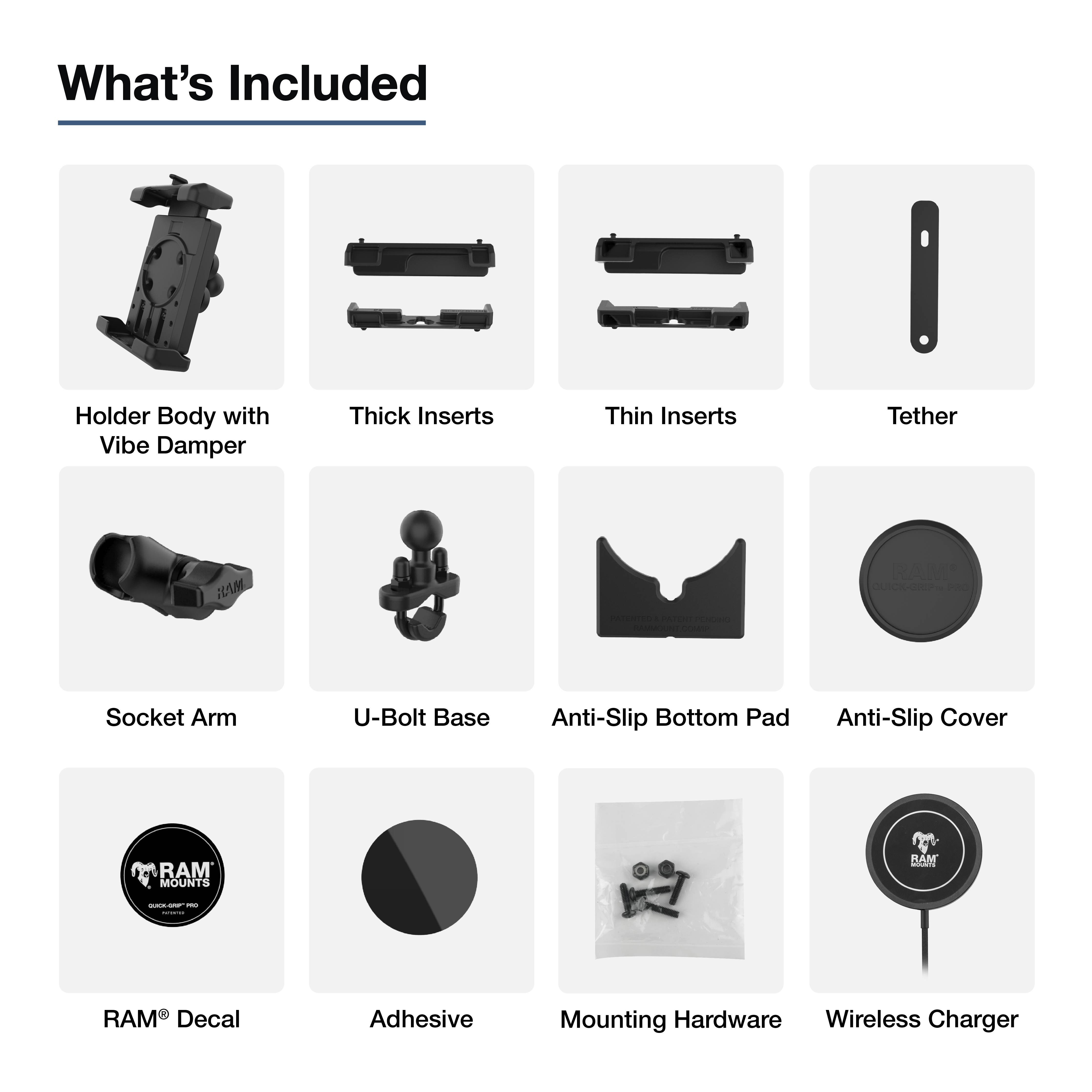 Le support de téléphone RAM Quick-Grip Pro XL à amortissement des vibrations et chargeur Qi2 15W (RAM-B-149Z-A-PD7V-W2MU) est une solution idéale pour guidon, intégrant la prochaine évolution de la série RAM Quick-Grip, repensée pour être le support de téléphone universel le plus robuste qui convient à une large gamme de téléphones et d'appareils portatifs. Ce support de téléphone est livré avec le chargeur sans fil RAM Qi2 et dispose d'une cavité intégrée pour le maintenir en place. Ce support de téléphone est livré avec un couvercle antidérapant assurant un ajustement parfait lorsque le module de charge sans fil n'est pas installé. Le RAM Quick-Grip Pro XL présente une conception à ressort qui permet une insertion et un retrait faciles de votre appareil d'une seule main. Des cales grandes et petites sont incluses pour offrir un ajustement serré et sûr aux téléphones grands et petits sans housse. Ce kit comprend une base en U pour guidon zinguée qui s'adapte aux rails de .5 à 1.25 in de diamètre. RAM recommande d'installer l'attache d'appareil fournie lorsque ce support est utilisé dans un véhicule avec un habitacle ouvert. Il est important de vérifier les dimensions de votre appareil portatif avec sa housse, sa pochette ou sa coque lors de la détermination de la taille globale.