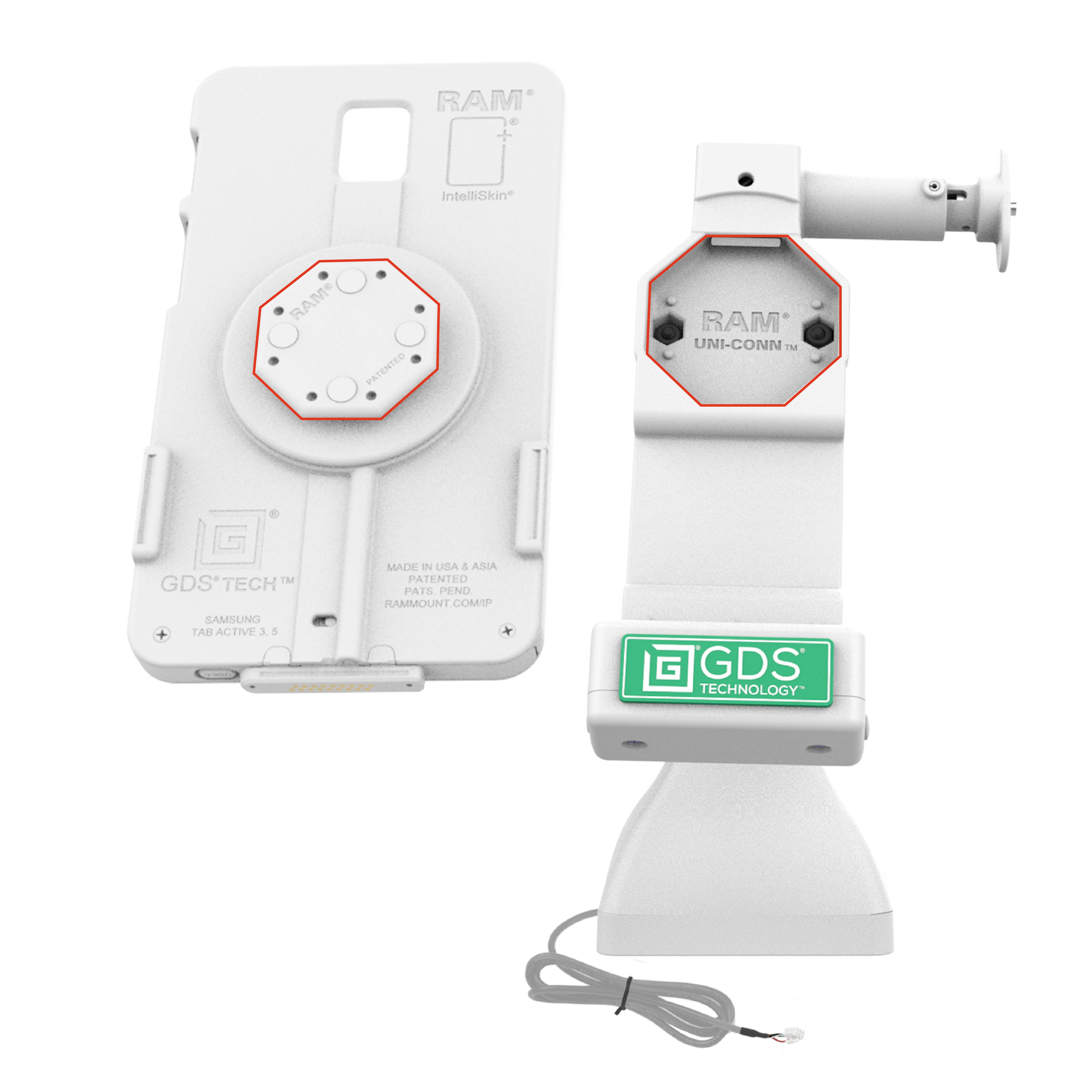 • Gris clair, dock de pied de 17,78 cm (7") avec verrouillage à clé pour appareils enfermés dans un IntelliSkin® avec connexion en forme de D et adaptateur GDS® Uni-Conn™