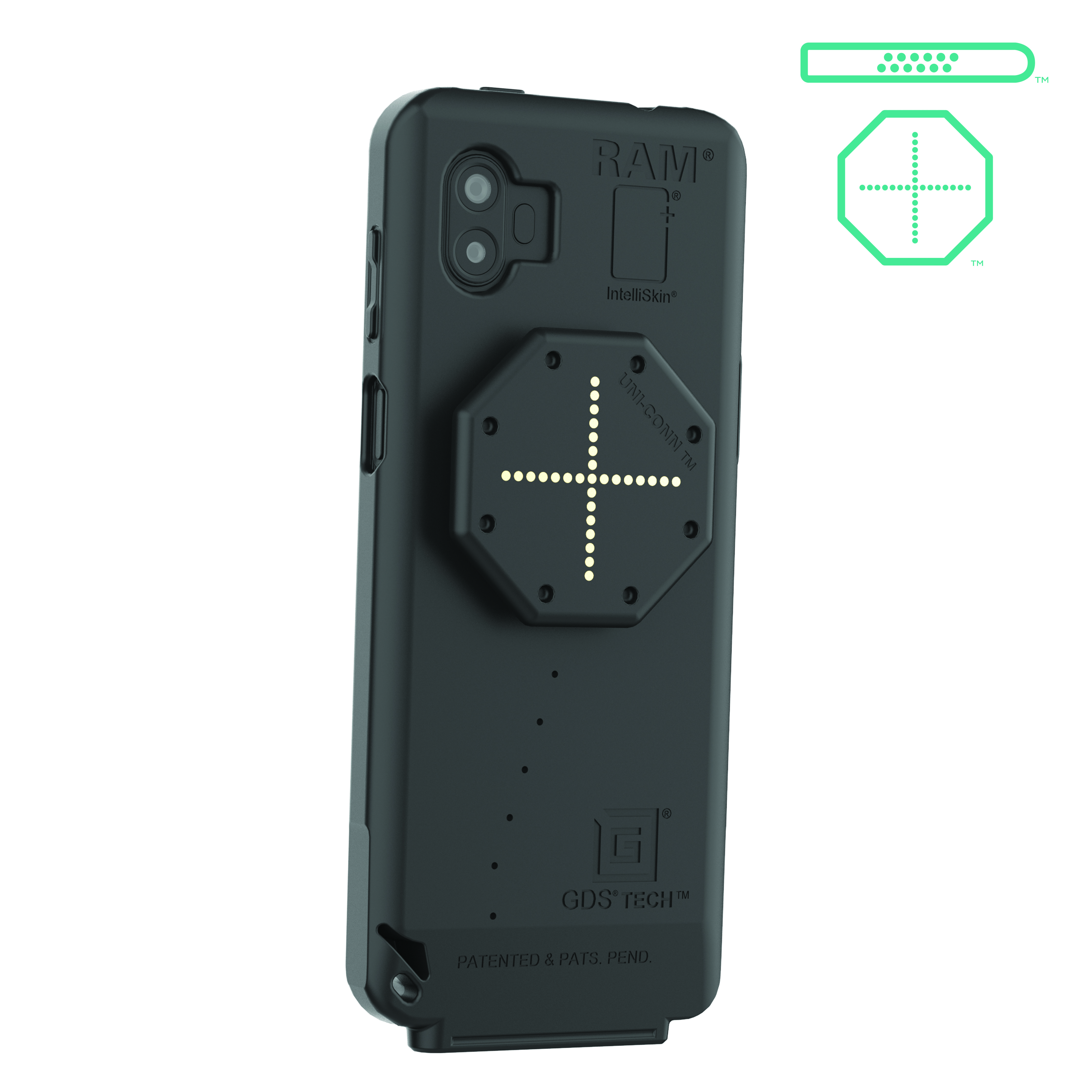 • Housse protectrice fabriquée en caoutchouc amortisseur de chocs et dotée de deux connecteurs GDS® intégrés – plots pogo arrière et plots pogo de forme en D distinctive.