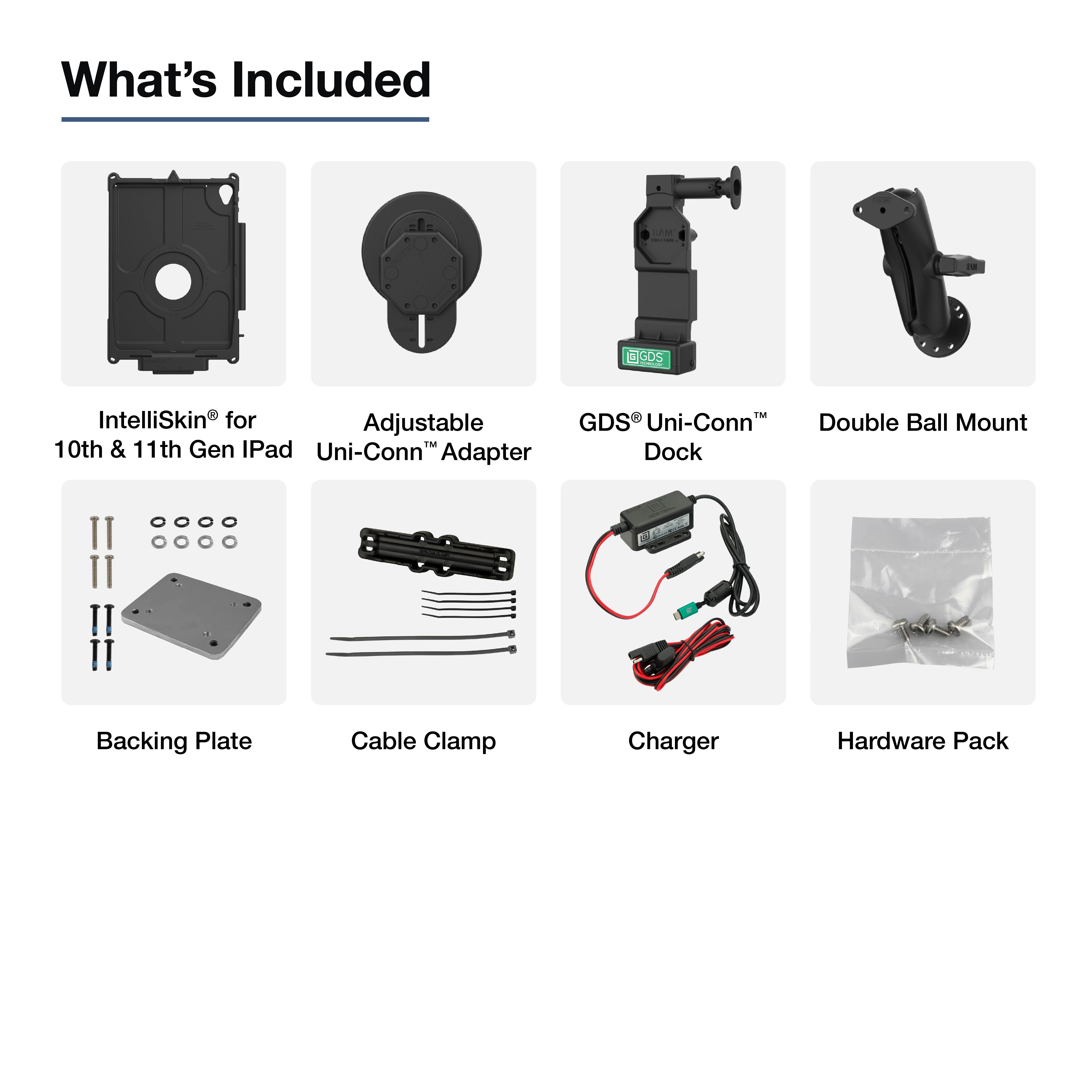 • Le kit comprend la station d'accueil GDS® Uni-Conn™ avec bouton de libération rapide, l'adaptateur Uni-Conn™, l'IntelliSkin® Next Gen pour Apple iPad 10e et 11e générations, un support à double bille de Taille C avec bras moyen, un adaptateur de plaque de support, un chargeur câblé 10-30V avec connecteur USB-C, et un serre-câble.