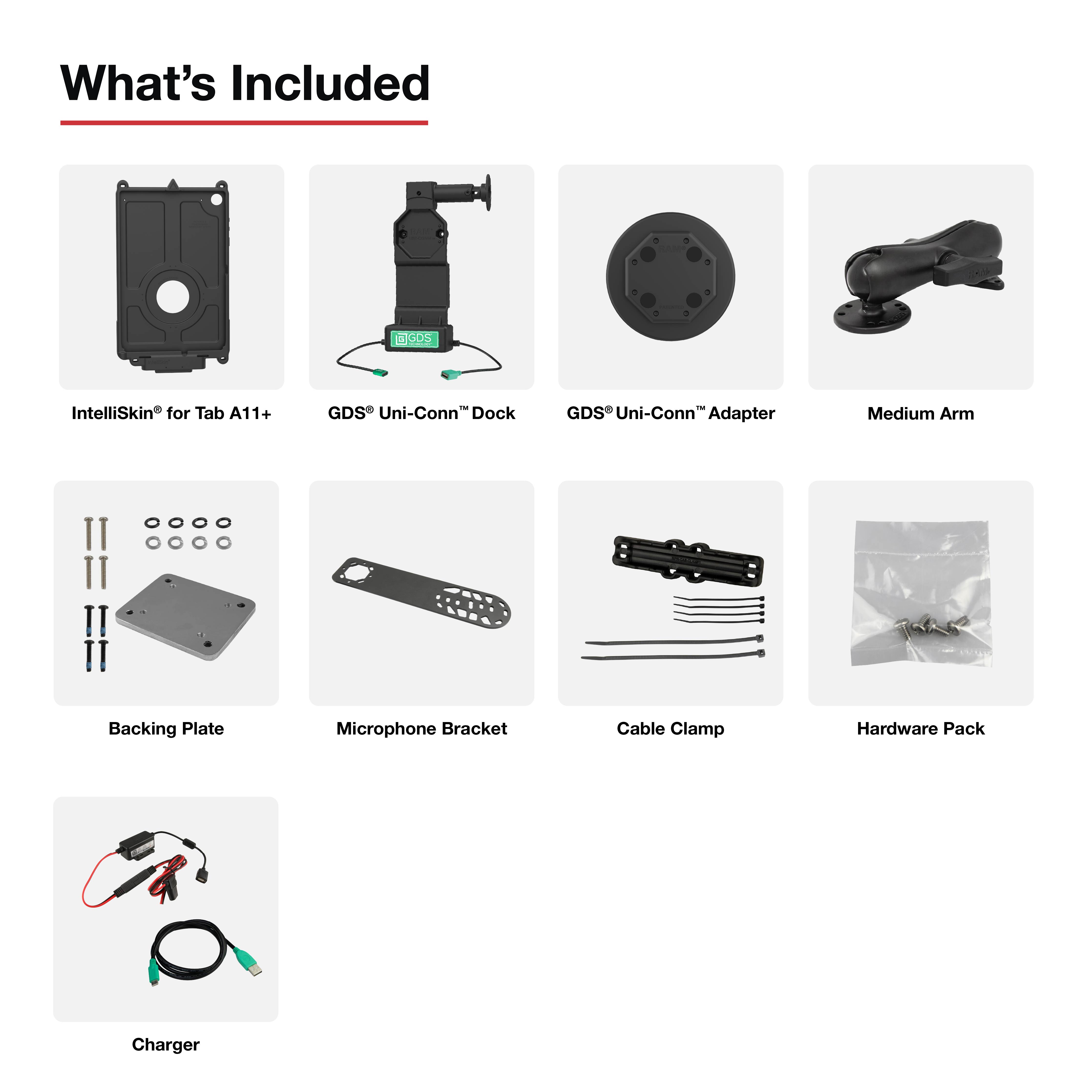 • Le pack comprend la station d'accueil GDS® Uni-Conn™ avec bouton de libération rapide, l'adaptateur Uni-Conn™, l'IntelliSkin® pour le Samsung Tab A11+, un support de microphone, un chargeur filaire 10-30V avec connecteur USB-A, un câble d'extension 2.0 USB-A mâle vers USB-C mâle, un kit de fixation de câble, et un support à double bille avec plaque de support.