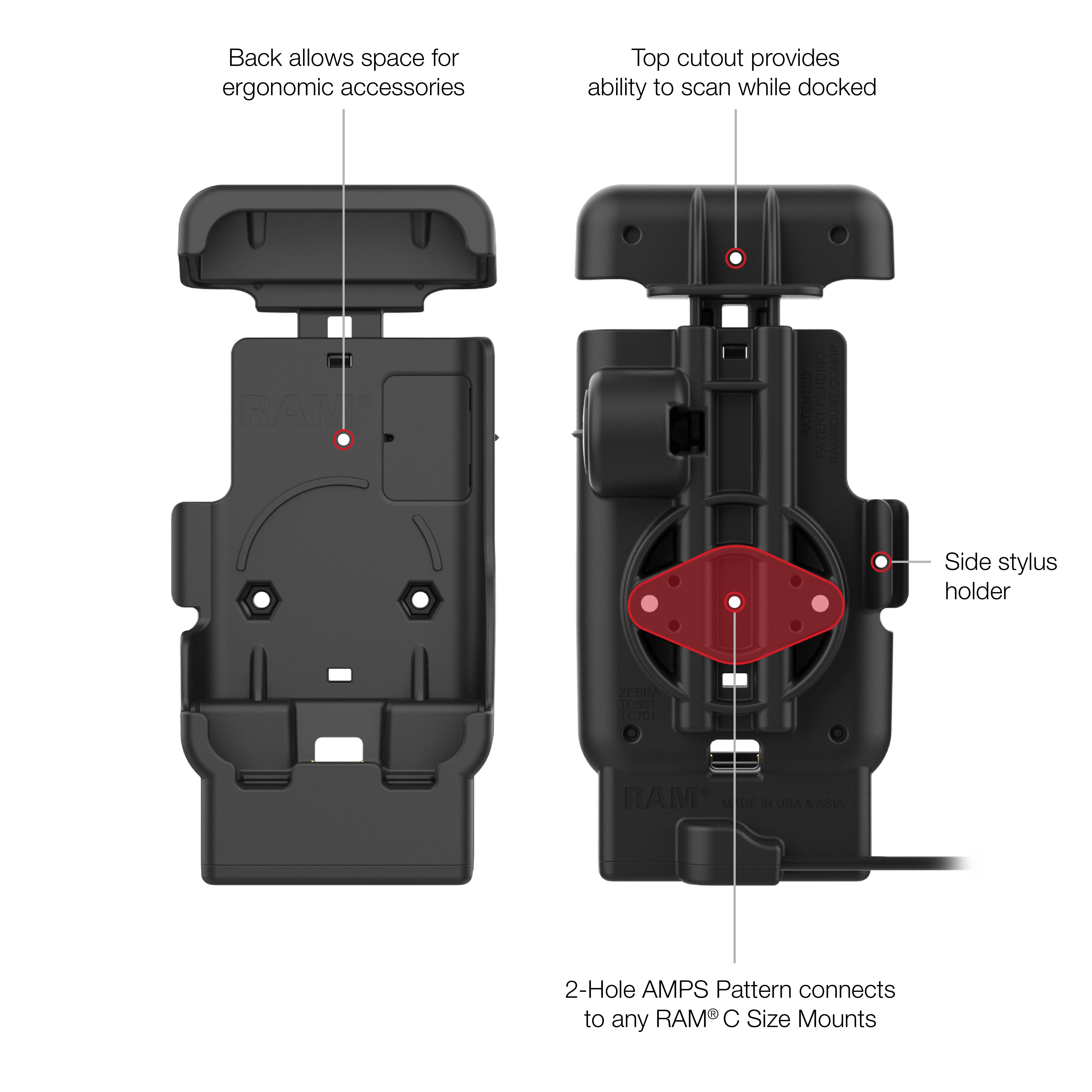 La station d'accueil RAM alimentée avec USB-C pour Zebra TC701 (RAM-HOL-ZE41C-1U) est conçue pour faciliter les flux de travail dépendant du transfert de données, tels que la connexion à des postes de travail via Workstation Connect de Zebra. La conception à ressort permet aux opérateurs de fixer les appareils rapidement et en toute confiance, minimisant les manipulations maladroites et réduisant le risque de dommages au connecteur USB-C. La découpe intégrée dans la partie supérieure permet d'accéder aux boutons, ports et scanners sans retirer l'appareil, afin que la productivité ne ralentisse jamais. Complétez votre solution de montage en toute confiance: ce support est compatible RAM et dispose d'un motif AMPS à 2 trous pour une intégration transparente avec un adaptateur à bille diamant.