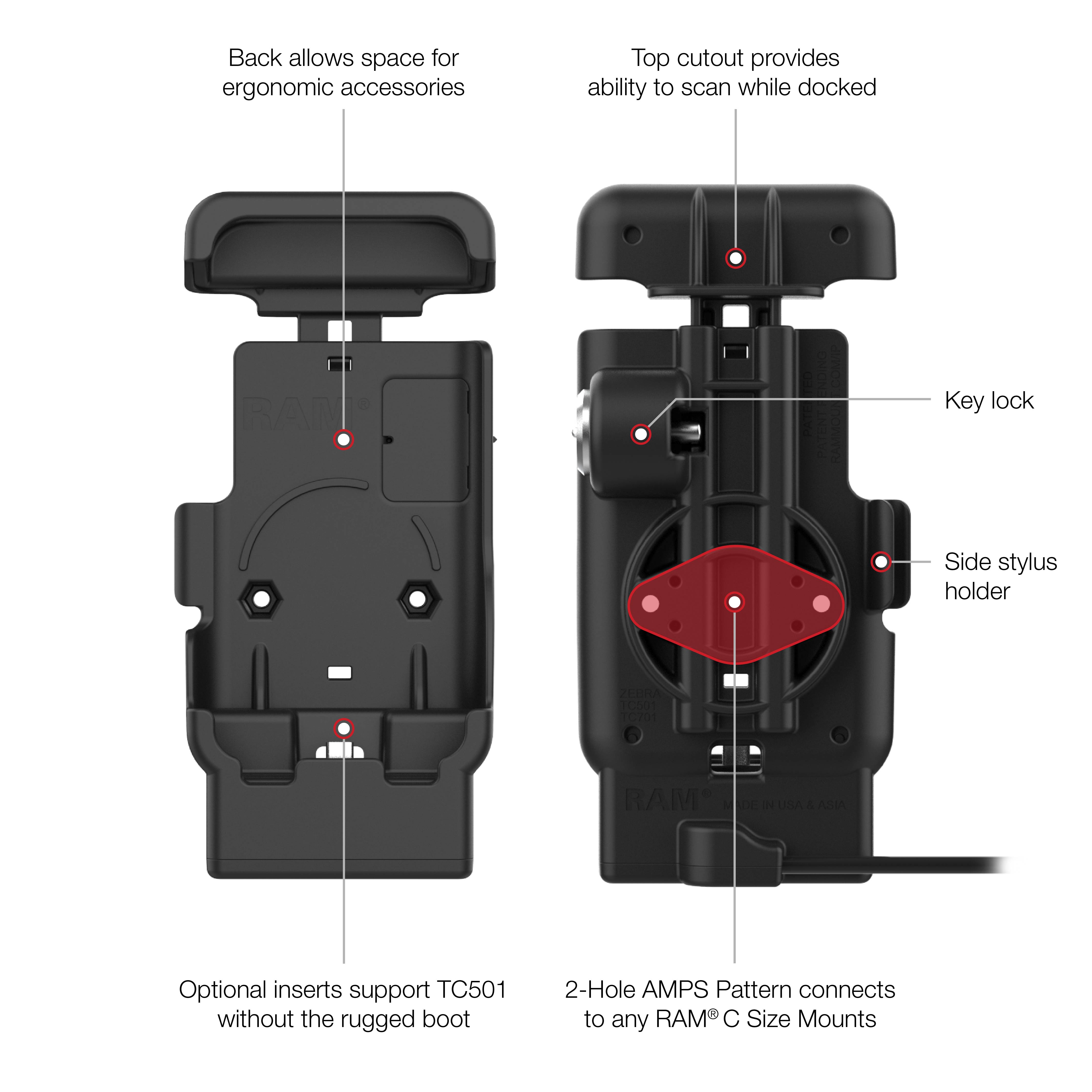 Le support verrouillable alimenté RAM avec USB-C pour Zebra TC501 (RAM-HOL-ZE41KL-C-2U) est conçu pour faciliter les flux de travail dépendants du transfert de données, comme la connexion à des postes de travail via Workstation Connect de Zebra. La conception à ressort permet aux opérateurs d'ancrer les appareils rapidement et en toute confiance, minimisant les maladresses et réduisant le risque de dommages au connecteur USB-C. La découpe supérieure intégrée permet l'accès aux boutons, ports et scanners sans retirer l'appareil, ainsi la productivité ne ralentit jamais. Pour une sécurité accrue dans les environnements à forte affluence, le verrouillage par clé intégré offre une dissuasion fiable contre le vol. Complétez votre solution de montage en toute confiance, ce support est compatible RAM et dispose d'un motif AMPS à 2 trous pour une intégration transparente avec un adaptateur à bille en losange.