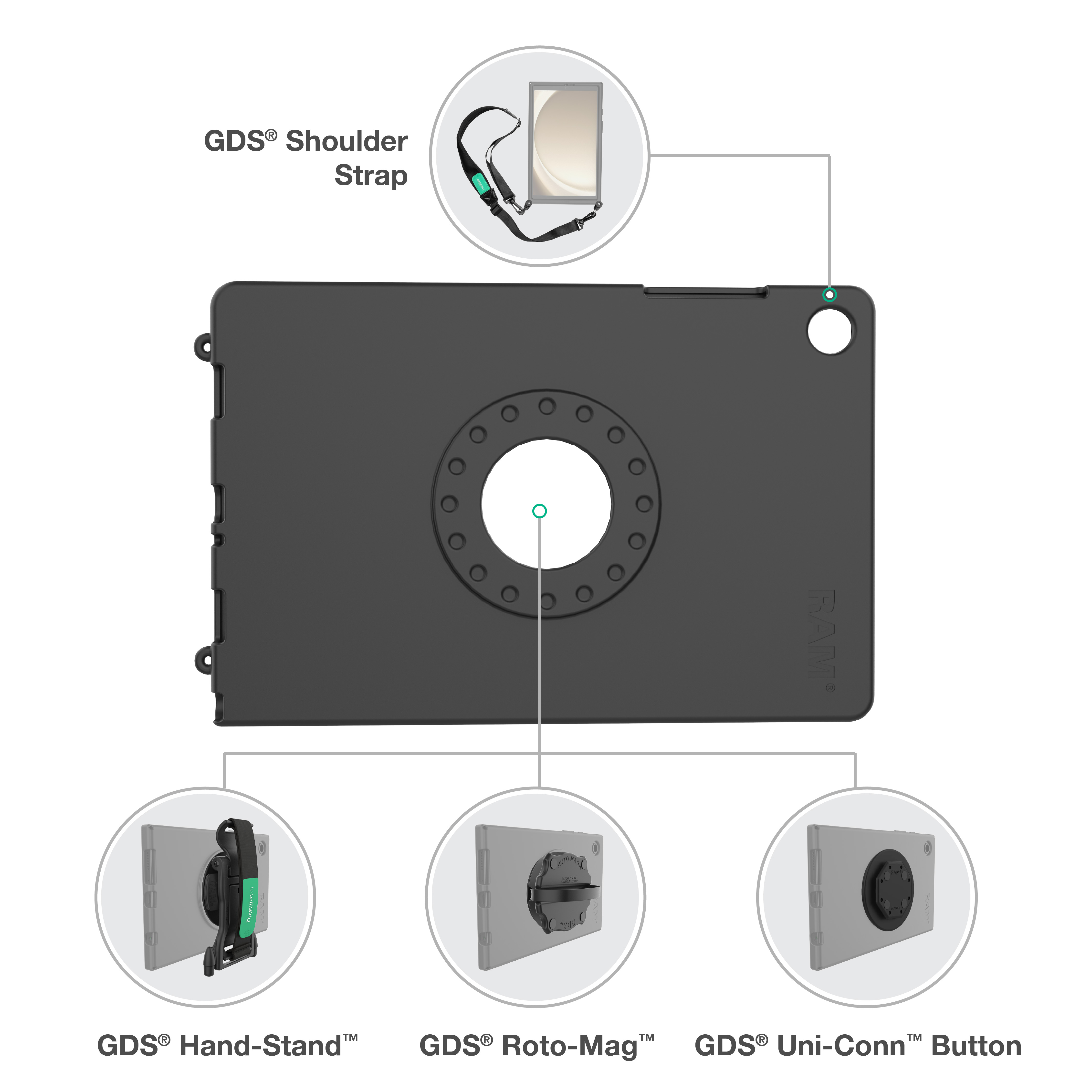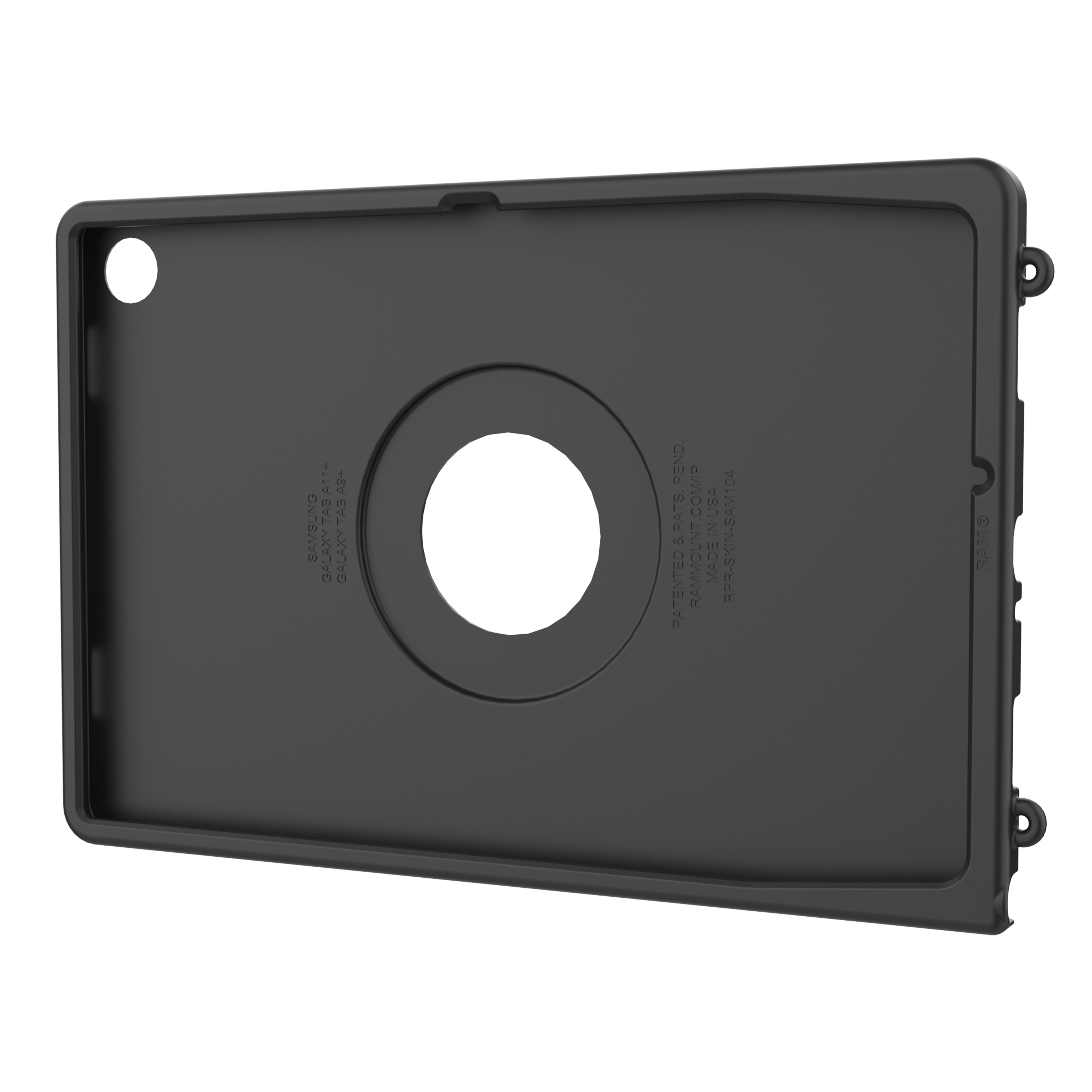 Le RAM Skin pour Samsung Tab A11+ (RAM-SKIN-SAM104) est une housse ajustée, protégée contre les chutes selon la norme MIL-STD-810H. C'est un accessoire non alimenté et il dispose d'un point d'accès ergonomique pour accessoires intégré à l'arrière pour des accessoires comme le GDS Uni-Conn Adapter, le GDS Hand Strap, le GDS Hand-Stand et le GDS Roto-Mag. Des points d'accès supplémentaires pour accessoires sont intégrés aux coins du RAM Skin, un emplacement idéal pour fixer le GDS Shoulder Strap ou le GDS Wrist Strap. Cette housse couvre les boutons de volume et de verrouillage pour empêcher la saleté et les débris d'entrer et est conçue pour laisser la caméra, le port USB-C et la prise casque accessibles.
