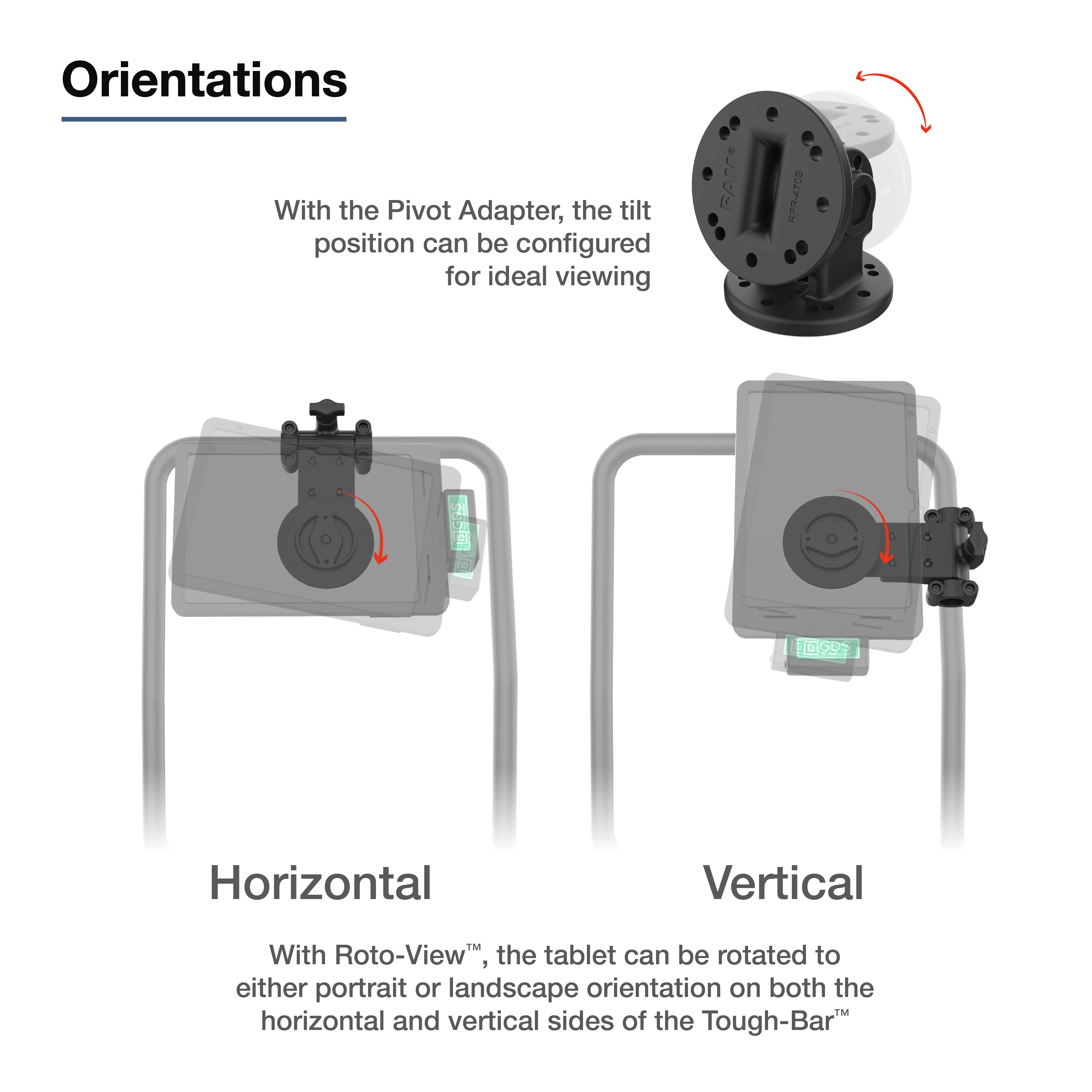 • La plaque d'adaptation Roto-View™ permet de faire pivoter facilement votre appareil en mode paysage ou portrait ; le joint d'articulation simple attaché fait pivoter les appareils jusqu'à 180 degrés pour une réglabilité accrue.