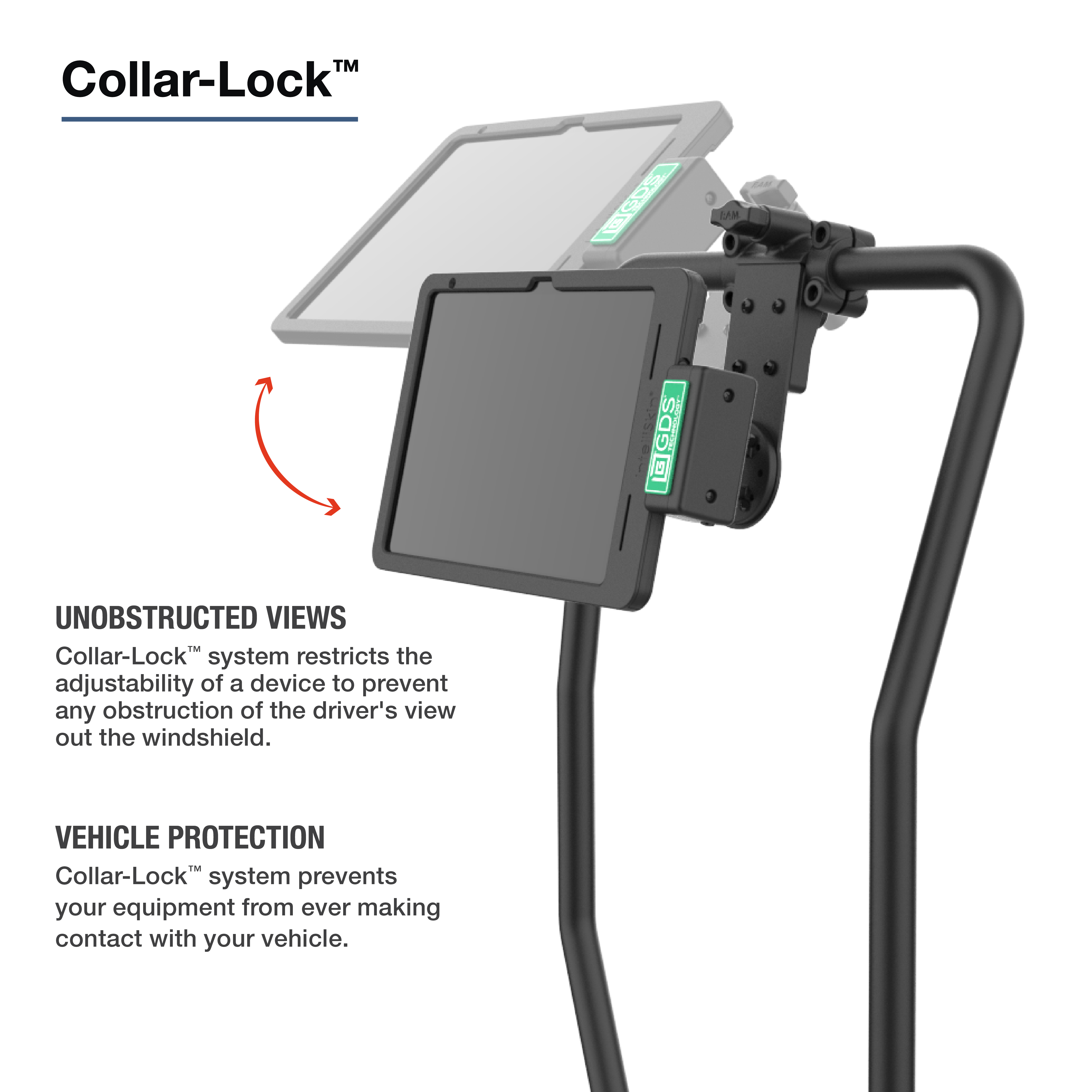 • Le système intégré Collar-Lock™ empêche la sur-rotation pour protéger les appareils et les intérieurs de véhicules lors d'un réglage ou d'un impact.